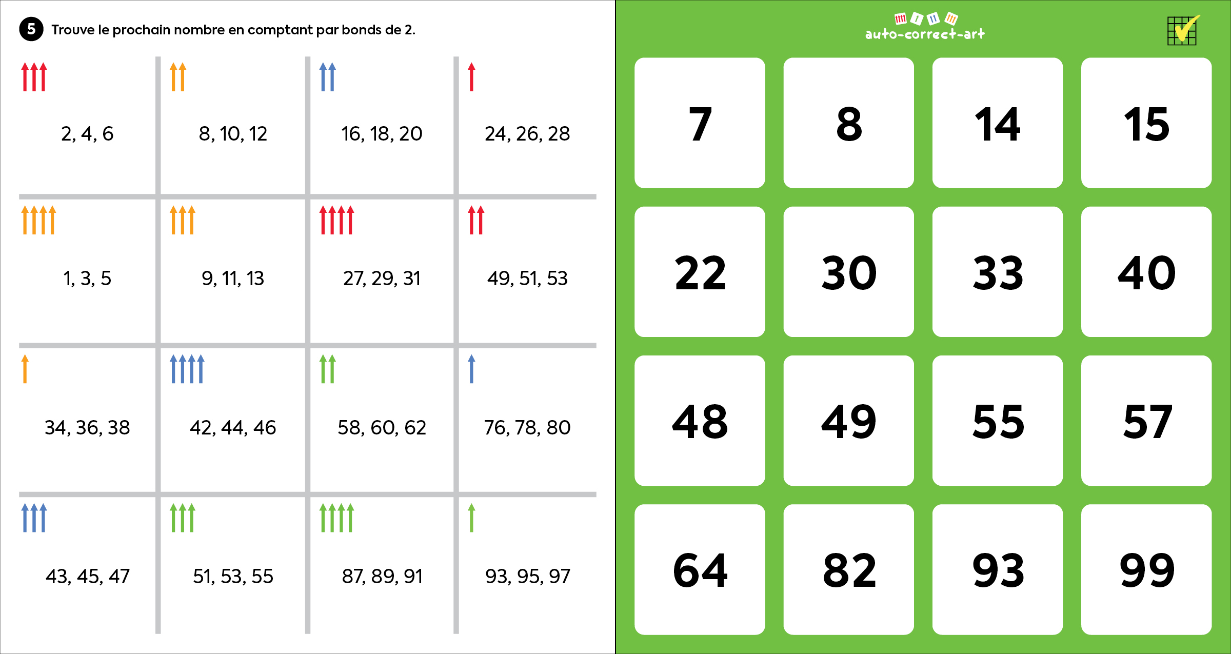 1 et 2, l’enfant devra placer les nombres en ordre croissant. Dans les activités 3 et 4, il devra de les placer en ordre décroissant. Finalement, dans les activités 5 et 6, il lui faudra trouver le nombre suivant en comptant par bonds.
